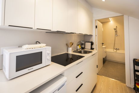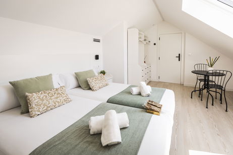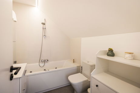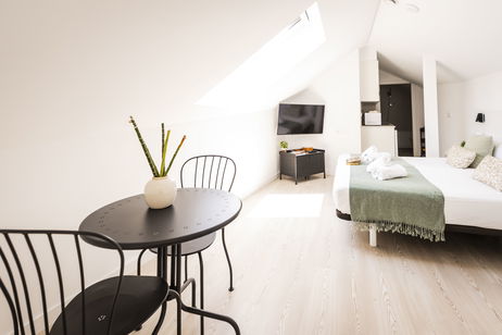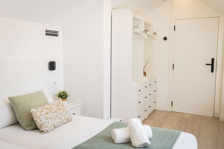 Disponemos de dos habitaciones, situadas en la planta más elevada del edificio. El ático más grande, con 27 metros cuadrados, alberga una cama de matrimonio de 150 centímetros, aire acondicionado, baño privado con bañera de hidromasaje, cocina, televisión, espacios de almacenaje y suelos de madera.
